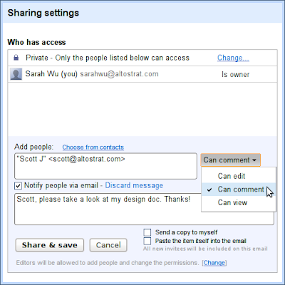 launched last week is a nice option for these scenarios. You can let others discuss and add their thoughts to your document—without allowing them to change your work. You can allow document comments from specific individuals or groups, from anyone belonging your organization or from the general public.